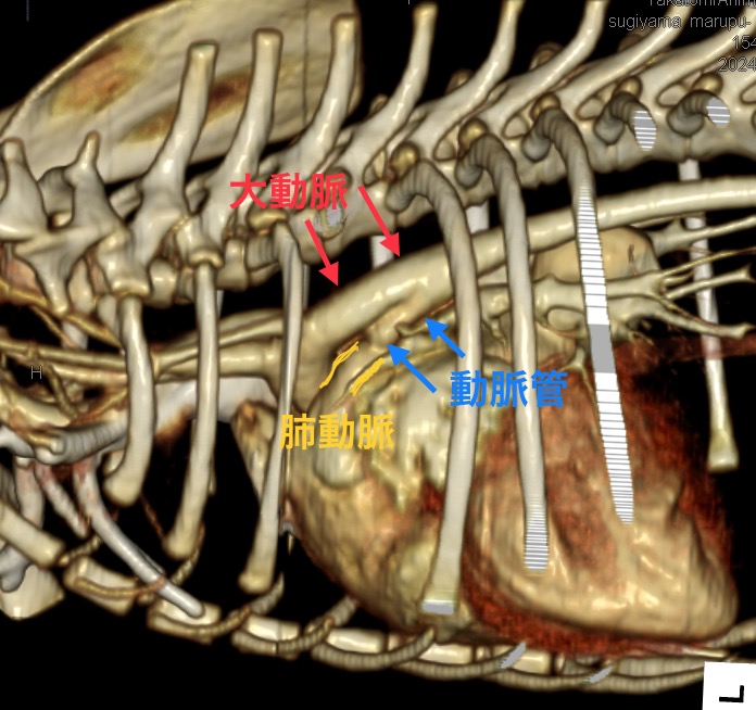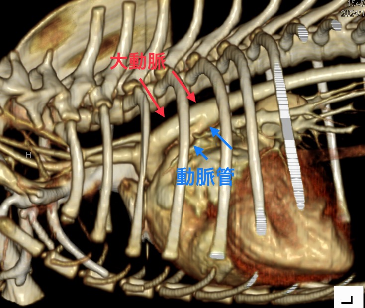この病気のCT画像ですが、動脈管がはっきりと写っています。切るべき切開部は大概決まったところで大丈夫なのですが、ごく稀にイレギュラーなケースもありました。CTをとると動脈管周囲の解剖や血管がはっきりしますので予めイレギュラーがないかとか、術式の計画が立てやすく、術中のトラブルが避けることもできるためとても重宝します。実際に手術時間の短縮につながりました。