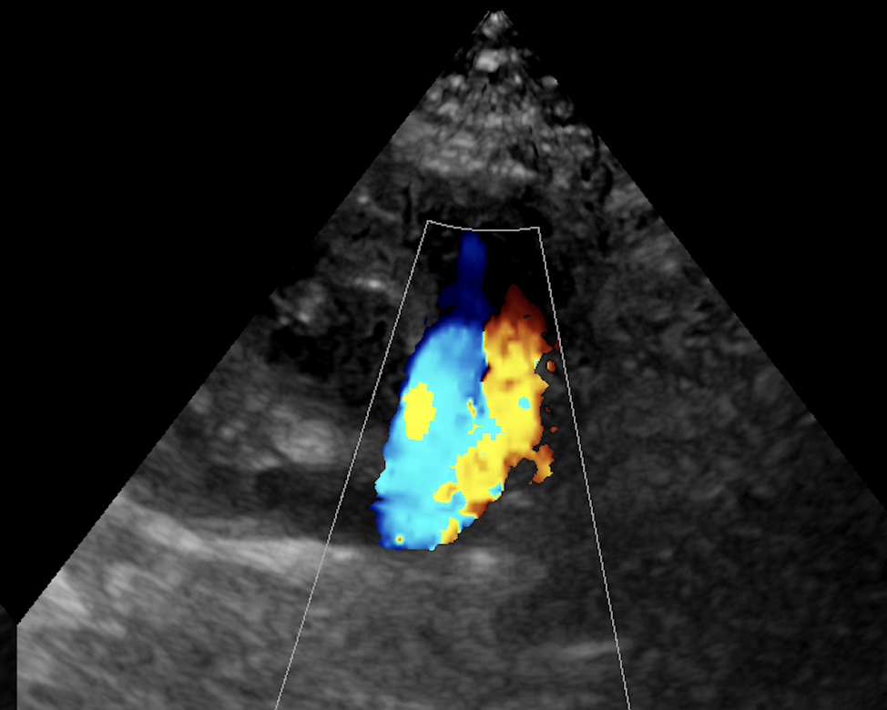 PDAの確定診断は心エコー検査が必要ですが、超音波を当てれば比較的簡単に診断できます。超音波検査で下行大動脈から左肺動脈へと向かう短絡血流を確認することが必要です。