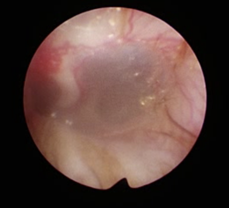 鎮静下で見せてもらうと草の実などの異物や腫瘍などはなく毛が鼓膜に刺さったり触れています。 実はこの毛による鼓膜への刺激というのは意外と多いのです。急に発症する子や慢性経過の子もいます。